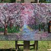 Imagine walking through this trail of beauty as the gentle motion of the blossoms whisper from the canopy above. The seasoned bark of the tree trunks provides a feeling of aged warmth as your eyes flicker at the roseate beauty above. The painting is executed in Clear Impressionism style in thick oils with bright colors, fluid motion, and engaging texture. Canvas is stretched on a heavy-duty 1.5” wide wooden stretcher bar in a gallery wrap style with painting going on all 4 sides, hardware attached, and ready to hang.