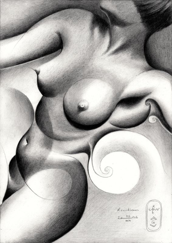 Last One This Year This graphite pencil drawing ‘Roundism – 30-12-22’ is the last one of this year. After Neo Deco – 25-12-22 I wanted to end this year in the style that brought me success the last decade. One could also argue that I just don’t know where this particular style is heading for anyway. Surely I have this other thing, called ‘Neo Deco’ but I am not sure yet where this is going. Recently I wrote about my uncertainties with regard of serving something old as a new style. That is how it feels like, sort of. Maybe it’s just that I am trying to forge something out of dusty air of a bygone era. It’s definitely a topic I want to delve much deeper into in 2023. For now I named all things round ‘roundism’ and cubistically straight things ‘neo deco’. A pretty daft distinction perhaps. What do you think? Golden Ratio The motif for this actual work was derived from a reference picture taken by Walter Bird. The last one I used one of his photos for was Art Deco Nude – 23-08-22. Even though the style of photographing is typically art deco I think his work stands out compared to many others. Not only did he use heavy doses of light and dark but also cropped nudes within the frame nicely. The result is a perfect bodyscape image. Due to the striking roundness of the breasts and tilted body position I thought drawing roundish shapes were almost unavoidable. I spotted some nice curves I extrapolated outside the female form. The onesbesides her hip culminated into the golden ratio curves. A suitable ending for this year. The ending and the beginning of something entwined, as it should be. So is my search for the eternal and essential in the temporary. Graphite pencil (Faber Castell Pitt Graphite Matt pencil 14B) drawing Talens Bristol paper (21 x 29.7 x 0.1 cm) Artist: Corné Akkers