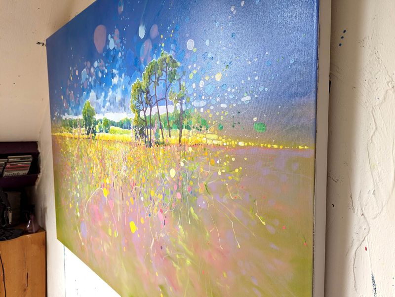 Transcendent Springtime is an exuberant semi-abstract painting of a springtime landscape with a brown hare in a wildflower meadow. It is 48x36 inches. The painting shows an ethereal scene whereby lots of particles, of various sizes, move in towards the centre of the painting where they coalesce into a joyful spring landscape. The brown hare is well disguised among the flowers and looks vaguely surprised by the way his world is in the process of being created or is possibly dissolving. This is partly inspired by the fact that whilst I love springtime, the flowers blooming and wildlife and bird activity changes very quickly from one week to the next and gives me a desperate urge to experience as much of it as I can before having to wait another year! A line of yellow flowers run across the middle of the marking the edge of the river. You cannot see the river itself but it has the meadow in the foreground and trees and fields in the background. The inspiration for this painting is a place near where I live in Forest by the bank of the river Medway. The feeling I was trying to convey is my constant one – Nature is beautiful, seasons are exciting, especially April and May, and our planet and its landscapes and wildlife need to be cherished and protected. Dedicated to everyone who is doing this from the person who picks up some litter to the David Attenborough’s and Chris Packham’s of the world – it is all valuable so thank you. Painted on deep edge canvas, white edges, no frame needed, ready to hang. /bddWCkwUOF8