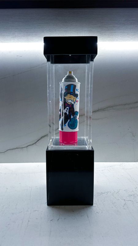 Limited Edition hand-painted spray, protected by a special 1cm thick acrylic box. The base that supports the sculpture is made of black marble. The sculpture's cap is made of black-colored wood. Discover a mesmerizing series of art sculptures that seamlessly blend the dynamic worlds of PopArt and Street Art. Each sculpture showcases iconic symbols of popular culture, captured in bold graphic shapes and vibrant colors that draw you in with their energy and style. Yet, beyond their captivating appearance, these sculptures carry a deeper message that invites reflection on the impact of consumer culture on our daily lives. In a nod to the PopArt movement, which elevated the status of everyday objects and images, by fusing together different cultural influences, these works offer a thought-provoking commentary on the complexities of our modern world. Meticulously crafted with care and precision, every sculpture is meticulously fashioned using acrylic and spray on cardboard, along with spray cans. Presented in a limited edition, safeguarded within a distinctive acrylic box that boasts a substantial 1cm thickness. The foundation is composed of sleek black marble, imparting a touch of sophistication to each individual piece. This collection stands as a genuine pinnacle of creativity and imaginative prowess. For connoisseurs of art in search of a collection that ignites inspiration and provokes emotion, this is an opportunity that simply cannot be overlooked.