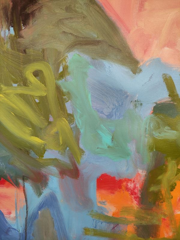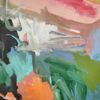 Abstract expressionism artwork in a colorful palette mainly green, blue, orange and pink. Worked in several layers with a professional and high quality painting with anti UV protection and velvet rendering. Edges are painted in the continuity of the work. Ships in a box, ready to hang