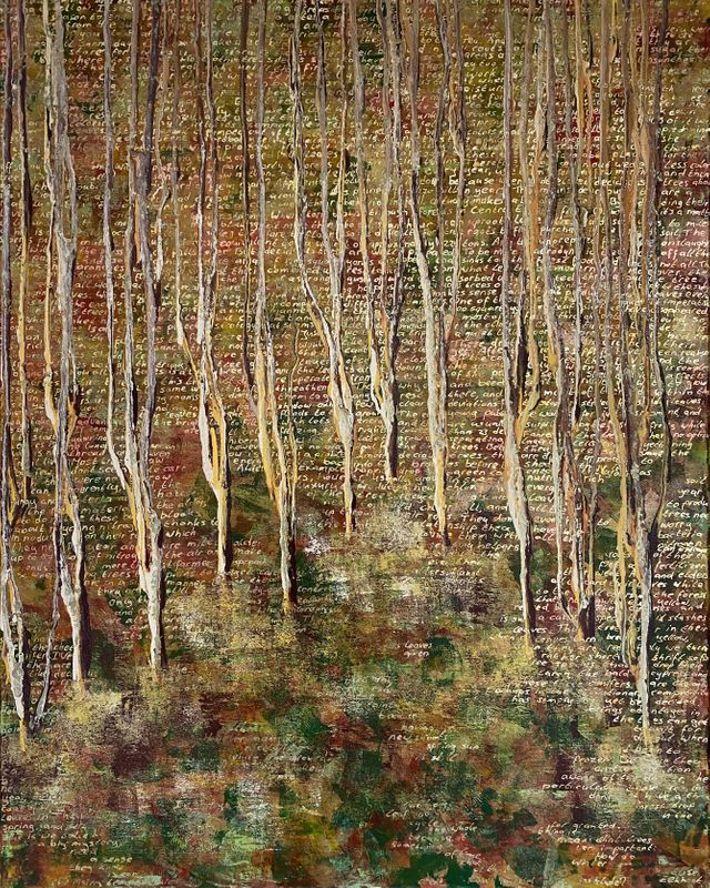 In “The Hidden Life of Trees” Peter Wohlleben writes that the forest is a social network. He describes how trees are like human families: they live together, ‘talk’ with each other, support each other as they grow, share nutrients with those who are sick or struggling, and even warn each other of dangers. His deep love of woods and forests is very clear in the texts. Peter explains the processes of life, death and regeneration he observed in his woodland. A walk in the woods will never be the same again. This artwork is inspired by the passages about preparing for the winter in fall. The artwork is framed in a blank wooden frame but can also be hanged without a frame because the sides are painted. The artwork is ready to hang.