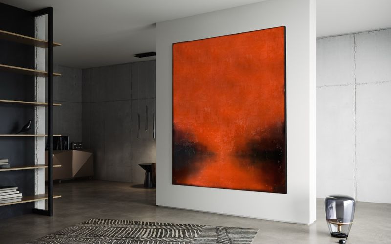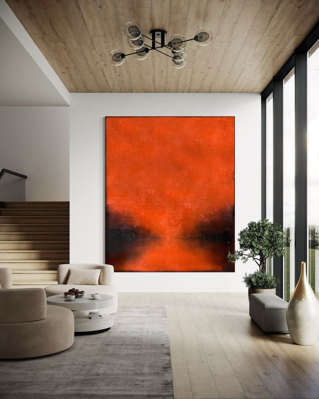 In creating this piece, I embraced the warmth and depth of red, channeling emotions of passion and the mysteries of the subconscious. I chose a minimalist, semi-abstract approach to invite the viewer into a world of introspection and contemplation. The textured, vintage-style finish adds layers of history and depth, making it a timeless addition that brings an energizing yet profound presence to any space. Many layers of heavy acrylics on canvas. This piece arrives in a roll, in which the customer may have stretched by a local frame shop or artist. The canvas extends over 2 inches on each side from the listed measurement of 96x80in, allowing it to be stretched over bars at the standard depth of 1.5 inches.