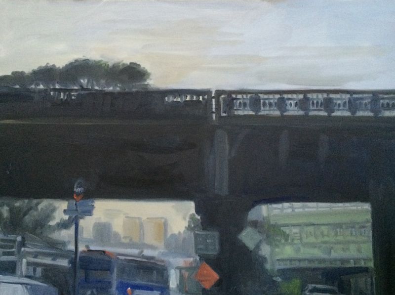Looking Up at the High Line focuses on a medium view of the structure.The viewer sees a large black band of the High Line with sky above, and activity below.